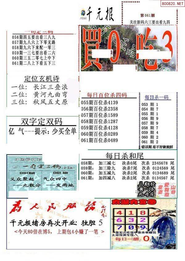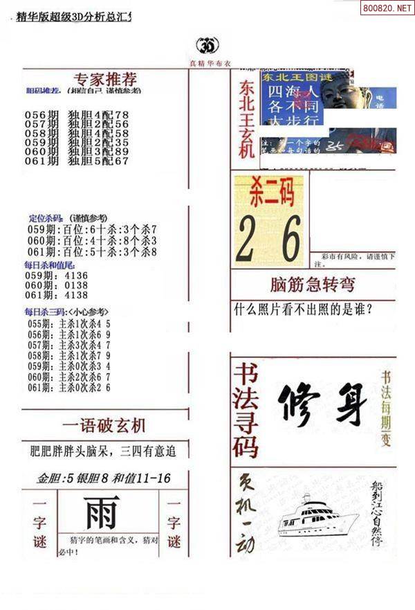 3D26071期[瓦大年]独胆双胆图