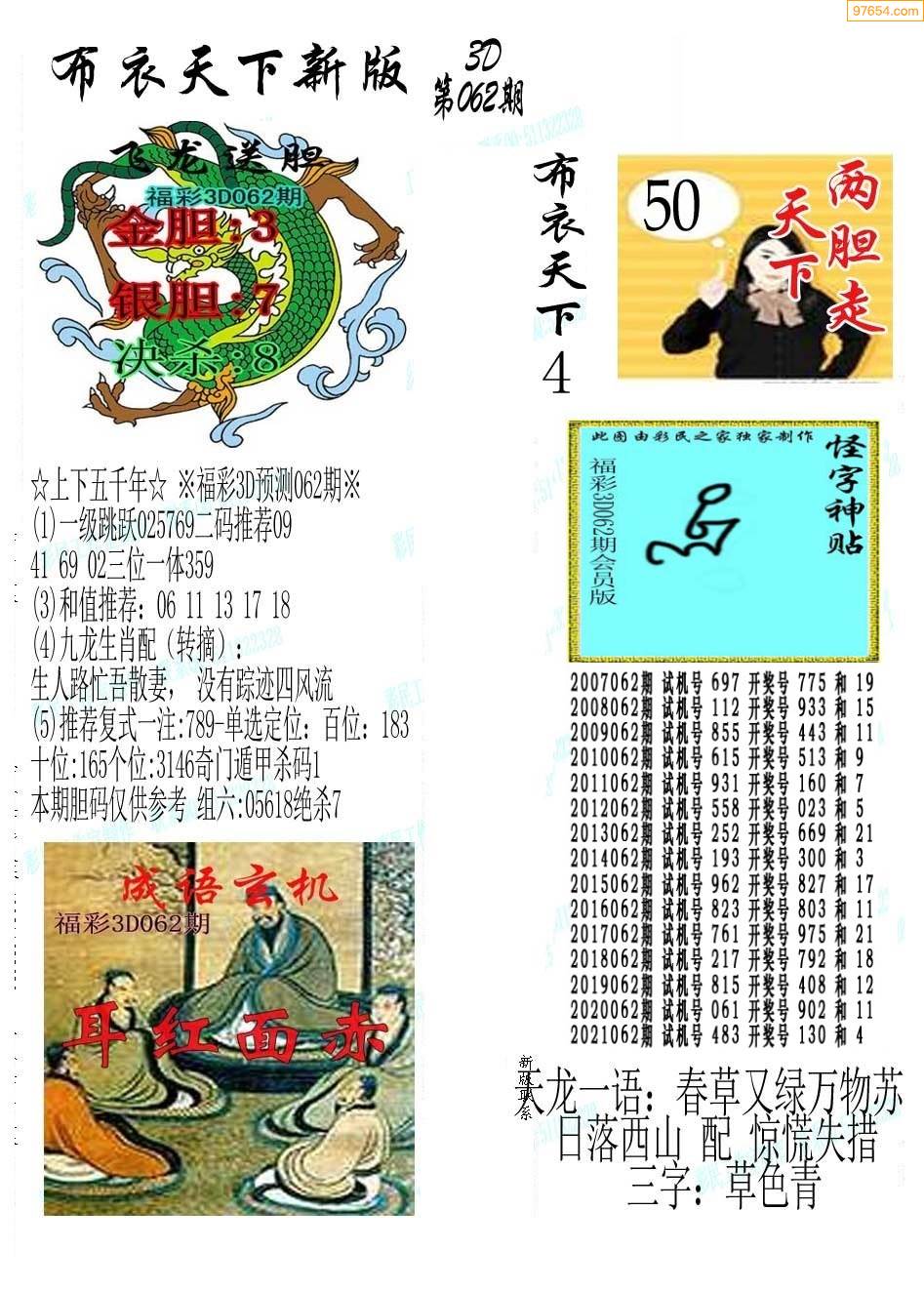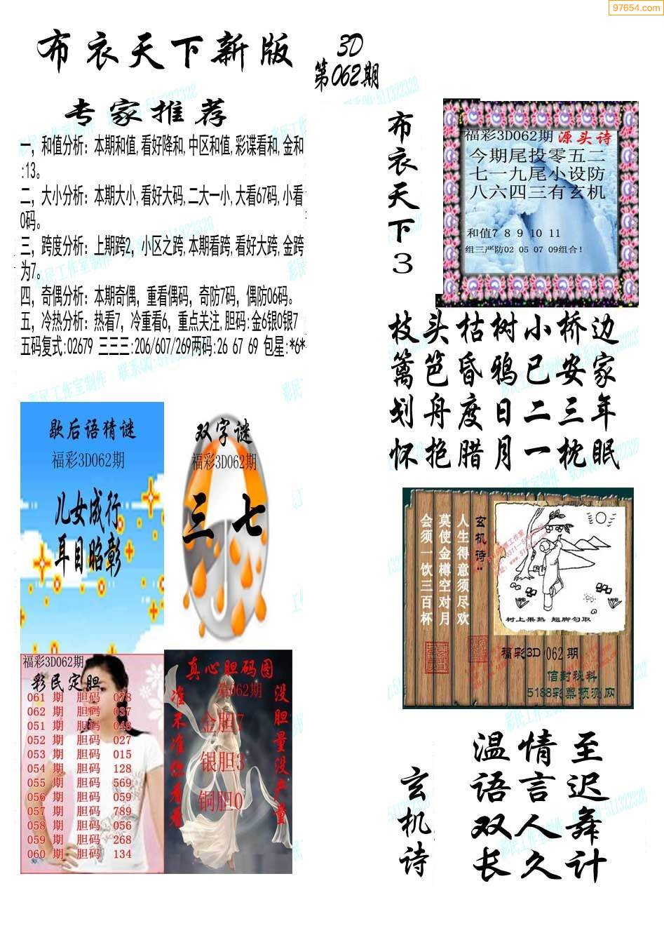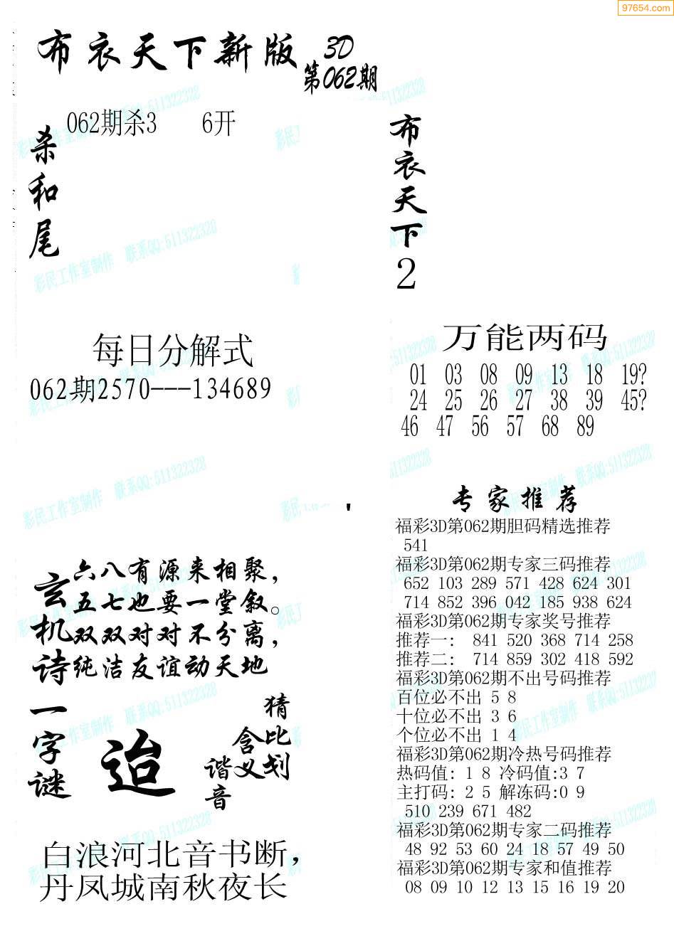 福彩3D062期专家推荐布衣天下1234