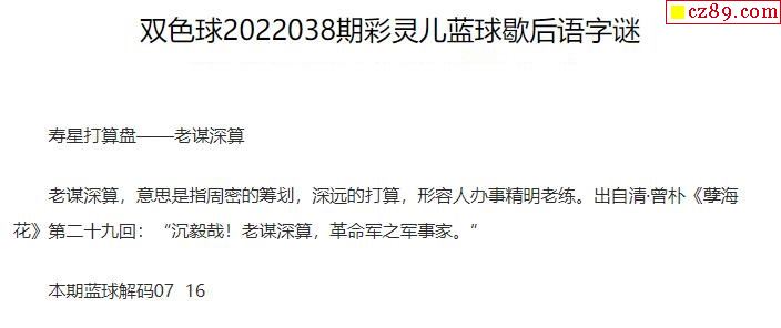 彩灵儿22年038期双色球蓝球歇后语字谜